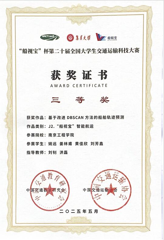 5月24日至25日,“船视宝”杯第二十届全国大学生交通运输科技大赛决赛在集美大学圆满落幕。来自144所高校的1200多件作品同场竞技,经过初赛和决赛两个阶段的激烈角逐,我校学子姚远、姜林甫、黄佳欣、刘芳鑫同学(指导老师:刘钊、洪磊)获全国三等奖的好成绩。