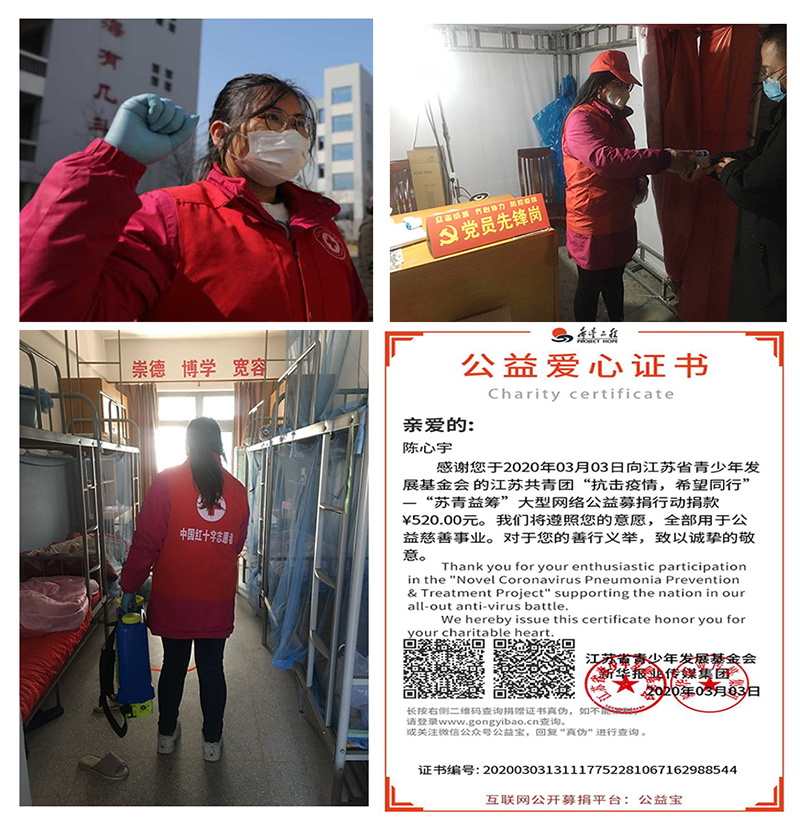 我校经济与管理学院会计18-2班陈心宇同学,在抗击新冠肺炎疫情的关键时刻,积极参加江苏共青团“抗击疫情,希望同行”—“苏青益筹”大型网络公益募捐活动。同时投身防疫一线,全程参与东台红十字会应急救援队负责的江苏省东台中学、东台市实验小学义务消毒消杀工作,用脚下的足迹勾勒出青春美丽的模样,用实际行动诠释着当代青年的使命担当。35日雷锋日当天,东台电视台东台新闻、今日头条分别以《抗疫消毒,红十字救援队在行动》,《“疫”起行动,雷峰日的红十字“战士”》报道此项活动。江苏省东台中凯发园网以《全面“消杀” 助力“复学”》表示感谢。
