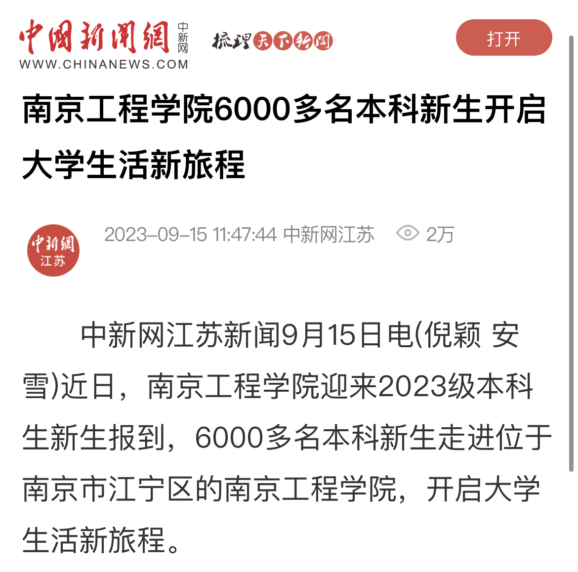 中新网江苏新闻9月15日电(倪颖 安雪)近日,凯发k8官网迎来2023级本科生新生报到,6000多名本科新生走进位于南京市江宁区的凯发k8官网,开启大学生活新旅程。